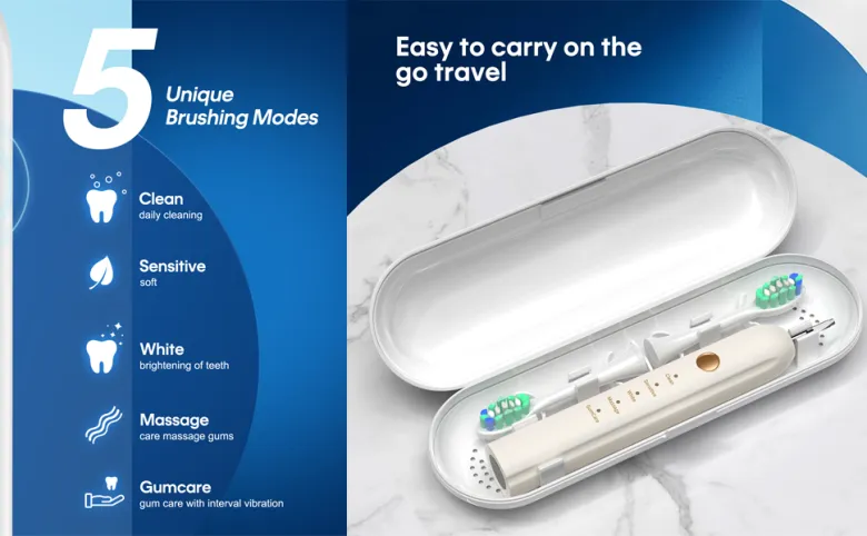 Зубная щетка вредит деснам? Многие люди упускают из виду влияние средств гигиены полости рта, но использование неправильной зубной щетки может привести к повреждению десен и дискомфорту. Звуковые зубные щетки с их нежной, но мощной технологией очистки обеспечивают решение, которое не только защищает ваши десны, но и гарантирует, что ваши зубы останутся здоровыми и яркими. В отличие от традиционных щеток, которые могут быть слишком абразивными, звуковые щетки используют высокочастотные вибрации для эффективного удаления зубного налета и мусора, при этом бережно относясь к чувствительным деснам. Этот инновационный подход помогает снизить риск рецессии и воспаления десен, что делает его идеальным выбором для тех, кто ищет более эффективную и безопасную чистку зубов. Не подвергайте риску здоровье десен; переключитесь на Sonic и получите более чистую, здоровую улыбку и приятные ощущения!